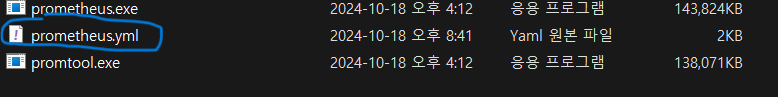 이제 프로메테우스가 특정 애플리케이션의 메트릭을 주기적으로 수집하도록 설정하려면 prometheus.yml 파일을 수정하여 애플리케이션의 /actuator/prometheus 엔드포인트를 호출하도록 하고, 수집 주기를 설정하여 프로메테우스가 정해진 간격으로 메트릭을 가져오도록 합니다. 파일 위치는 공식 홈페이지에서 다운로드할 때와 명령어를 통해 다운로드할 때 생성되는 파일의 위치가 다릅니다. 해당 링크를 참조해주세요. 공식 홈페이지에서 다운로드하시면 다운로드한 폴더 안에 있습니다.